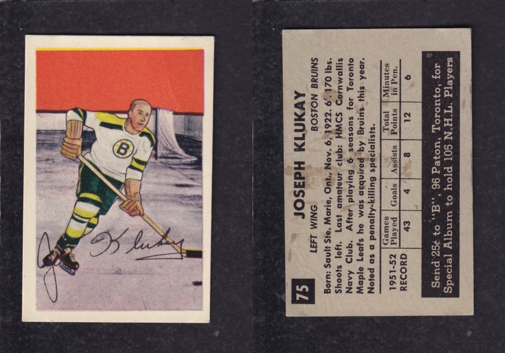 ITEM# : CS79777021 1952-53 PARKHURST HOCKEY CARD #75 J. KLUKAY DESCRIPTION 1952-53 PARKHURST HOCKEY CARD #75 J. KLUKAY CONDITION VG 2 CORNER SURFACE CREASE ON BACK PRIX $9.99 USD EXPÉDITION CANADA RESIDENT 3.00$