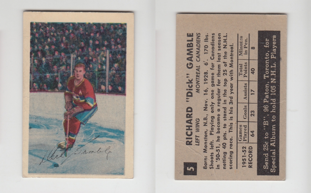 ITEM# : CS82683064 1952-53 PARKHURST HOCKEY CARD #5 R. GAMBLE DESCRIPTION 1952-53 PARKHURST HOCKEY CARD #5 R. GAMBLE CONDITION VG 1 CREASE PRIX $11.99 USD EXPÉDITION CANADA RESIDENT 3.00$