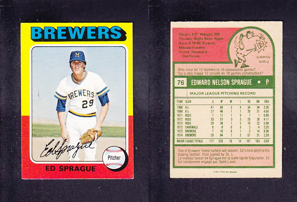 1975 O-PEE-CHEE BASEBALL CARD #76 E. SPRAGUE photo
