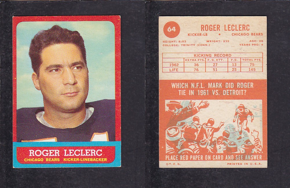 ITEM# : CS95702048 1963 NFL TOPPS FOOTBALL CARD #64 R. LECLERC DESCRIPTION 1963 NFL TOPPS FOOTBALL CARD #64 R. LECLERC CONDITION VG 1 CORNER CREASE PRIX $2.99 USD EXPÉDITION CANADA RESIDENT $3.00